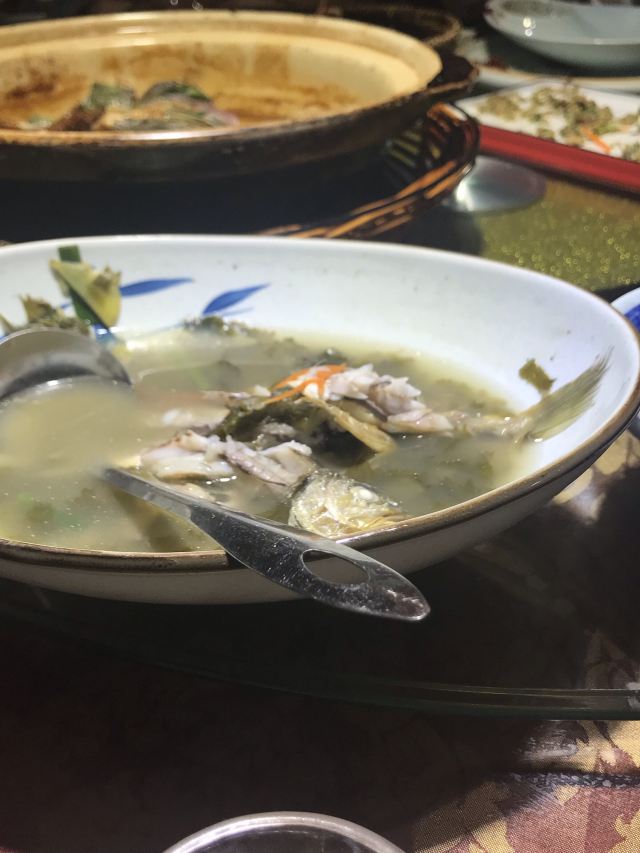 摆渡修行名气大的 应该不用多说 看菜点菜传统方式 最喜欢的「油渣芋艿小青菜」 没有把芋艿熬成甬府那种形式的细腻芋艿羹 而是偏家常的粗犷做法 保留了小切块 入口即刻软滑成糊 香脆的油渣充满油脂香气 而青菜刚好解腻 就一碗接一碗停不下来 酱青蟹,青蟹的蟹膏很饱满 调味没有咸呛蟹腌制得那么重 咸度完全可以空口吃 酒香和酱油味都不算突出 还有一丝微甜 作为招牌菜还是撑得起品牌的 蒜苗炒黄牛肉,没想到非海鲜类的菜式居然蛮好!可点 墨汁炒年糕,是融合了墨鱼面的创新菜嘛?店员一直猛推 反倒丢失了本地特色 不过宁波这边年糕真的不踩雷 软韧口感仿佛永远能把控到位 雪菜大黄鱼,禁渔期意料之内是冰鲜的 汤头的雪菜咸味比较明显 汤和鱼肉都比较平淡(算了 还是等开渔了再来吃鱼吧! 用餐即送水果和油炸汤圆 麻芯馅欠缺芝麻香气且甜度爆表了