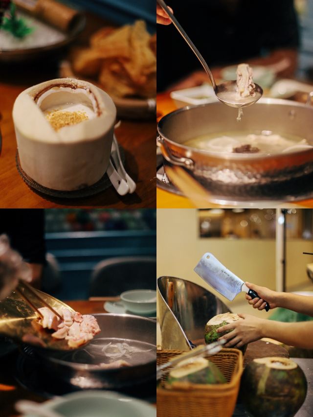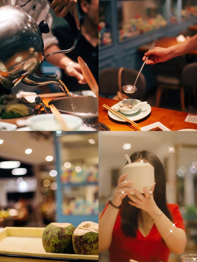 人生中第一次吃椰子鸡火锅,特打卡体验: 🍲店名:凤喜记.椰子鸡火锅 📍详细地址:城隍庙药行街168号亚细亚A座5楼 🅿️停车:免费停车位不好找,在附近绕了一圈有个收费的地下停车库,5元1小时 🕙营业时间:10:30-14:00 16:00-21:00 💰人均:100元 🖼环境:半开放式的餐厅设计,就在海底捞旁边,绿色的椅子看起来很清新,喜欢粉色的茶壶。门口有小哥在切新鲜椰子🥥。 🌿服务态度: 这个真的超棒了,刚开始会帮着调好调料,然后把新鲜的切好的2个椰子往锅里倒椰汁,放入生鸡肉,定时器4-5分钟,就可以开吃了。 第一口的鸡汤最鲜,服务员小哥哥已经在我碗里舀好了鸡汤,手还那么好看。路过的时候看见被子里的水少了都会主动给倒上。 ✔️原味椰子鸡半只: 细细品尝,在鲜美的鸡汤中能喝出椰子汁的甜味,半份鸡肉完全足够了,蘸着调料,新鲜的青橘口感清爽,吃惯了重油重辣的火锅,偶尔来个清爽的火锅也不错,还有椰肉和马蹄。 ✔️大颗粒青虾滑: 这个容易老,下锅后得马上捞起来吃,我们煮的时间有点多了; ✔️潮汕牛肉丸: 可能是鸡肉吃太多,鸡汤喝太饱,牛肉丸只品尝了几个,味道一般; ✔️海南粉芋头: 芋头糯糯的,很好吃,也是很多人推荐点的; ✔️自制豆腐皮: 最喜欢吃这个,很新鲜,满满一盘; ✔️椰子布丁: 冰冰凉凉的椰子布丁甜品,一下子就吃完了,很爽口,手捧椰子很好拍照; 因为吃太撑了,广式竹升面就没有品尝了,够吃三人份的了; 整体感觉还是可以的,价格也比较亲民。吃完之后也没有什么火锅异味。