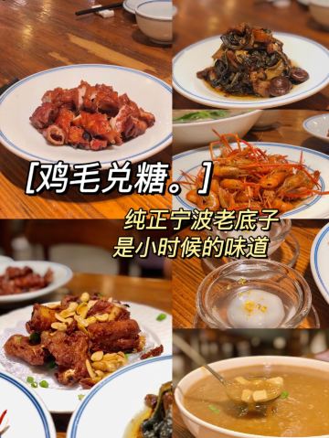 伊利伊利ELien要说起宁波老底子餐馆 鸡毛兑糖必有一席之地 在宁波立足十余年,开有家宴/尚宴/私宴三家门店,定位不同从而价位也由此差别 - 🏠【店名】:鸡毛兑糖·家宴 📍【地址】:百丈东路909弄(兴业银行背后) 👏🏻【推荐】:「脆皮大肠」「三鲜汤」「流泪汤圆」「椒盐排骨」 💰【人均】:130元/人 - 「烤菜」 最喜欢点的前菜就是烤笋和烤菜了,鸡毛的烤菜做的有一些太过入味咸口,配上米饭或是粥倒是非常合适。 「脆皮大肠」 他家的大肠,必点❗️去晚了可就没有了 抱着最后一份偷着乐的我们美滋滋的吃着 大肠趁热吃,处理的很干净,大肠肠皮脆嫩 「椒盐排骨」 椒盐排骨大小正好入口方便 整个香脆好吃,很容易脱骨 - 没有许多的花里胡哨和菜品出色 有的只是简单纯正的口感和做法 若想吃宁波菜,来鸡毛,绝不会出错🥳