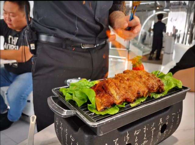 轻罗珊珊宁波又开了家网红店,趁中午人少来打个卡📌 🚗交通:地铁1号线“江厦桥东站”C口沿着箕漕街走900米,很近。周边因为是市中心地带,公交车网络也很发达✔️ 📌不过因为老城区,周边停车不是很方便,望知 🌿环境:外观和内里的装修都非常ins,洋气又科幻 🛎服务:给表演火焰肋排的点火,别的服务没有啥特别 甚至一般吧 🥘肥牛和牛蛙的故事🥘^招牌菜确实味道还可,汤看着红却不辣,肥牛配上酸麻的汤汁很赞。但是量特别少,小小的一锅,没几口吃完了。 🍖火焰肋排🍖^也是招牌,服务员会来点燃火焰,肉质还算嫩,不过酒精的味道在肋排上没有怎么提现。 🐂小牛肉手卷🐂^当日点的最垃圾的一道菜,光摆盘就感觉肉眼可见的廉价,味道。。。真的不好吃 🍏仓库蟹黄粉🍏^ 无功无过吧,没有蟹黄的味儿,就是一道海鲜炒粉丝而已。 🥀总结下就是:对于这家店的向往始于它的颜值,但是最终拔草,不会再来第二次的餐厅;现代信息化社会,一家成功的店的营造,不仅依靠装修外观、话题,如何能够长久终究不过味道二字。 📍地址:宁波市鄞州区大步街38号 💰人均:¥130(性价比不高) 🔊推荐指数:🌟🌟🌟半