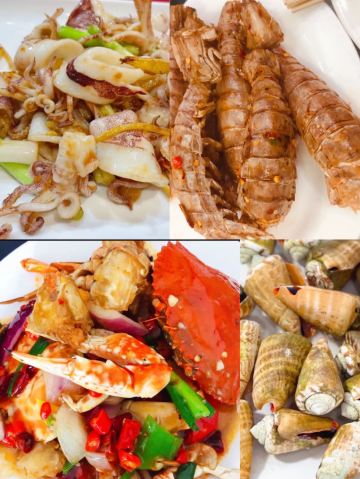 奶香花卷,清蒸石斑鱼,招牌香辣蟹,白切文昌鸡,蒜蓉生蚝,清蒸大龙虾,椒盐皮皮虾,清蒸生蚝,海南特色椰子饭,丝瓜蒸墨鱼仔,蒜蓉粉丝蒸扇贝,香炸鱿鱼圈,香辣蟹