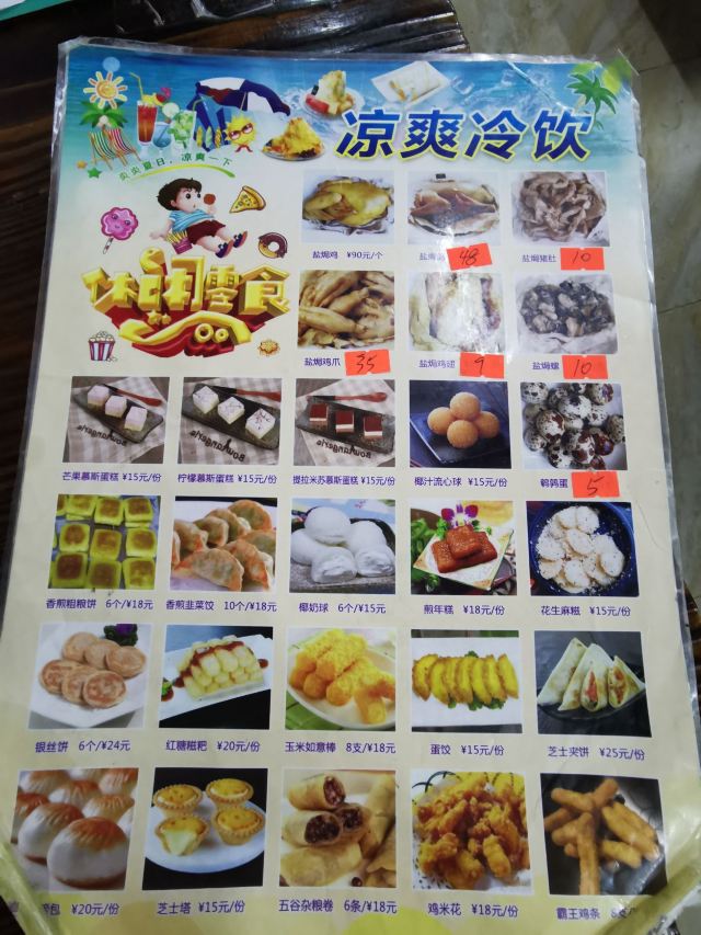 芒果肠粉,榴莲绵绵冰,椰汁清补凉,榴莲布丁,杂粮西米露,抹茶绵绵冰,芒果西米露,榴莲不舍,炒螺,姜汁冰激淋,芋圆奶酪布丁,姜汁冰淇淋,肥肠卷,盐焗鸡,芒果绵绵冰,玉米烙,百搭酱蒸鸡爪,煎面,高粱卷,椰子冻奶