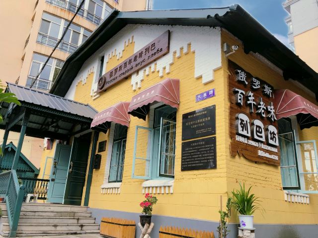俄罗斯百年老味列巴坊位于大直路43号和梨树街东北侧的街角处 是一栋单门独户的百年俄罗斯民居 俄罗斯百年老味列巴坊 黄色的墙上外墙上悬挂招牌 很是醒目 踏级而上 可以闻到扑面而来的面包香味 餐厅前院摆放了整齐用来烤面包的木柴 进门可以看到房间正中间的俄式大烤炉 房间摆设了不少品种的列巴 在另一角落辟有小小的就餐位 等着面包师把列巴从烤炉拿出 就着果酱喝咖啡吃列巴很有感觉 百年列巴就是相对现代化的电烤箱烤制面包而言 采用的是俄式古法的不加添加剂用原始自然成长的啤酒花制作 品尝起来会有嚼头 口味自然略带酸味的面包味 最好配咖啡牛奶就果酱品尝最佳 📍详细地址:大直路与梨树街交叉口