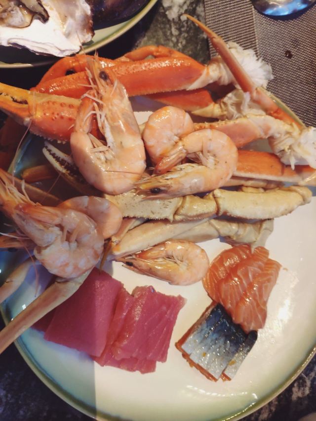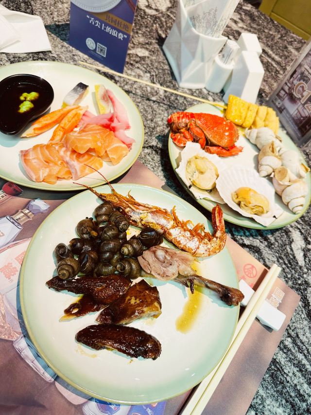 烤羊排,三文鱼,牛肉锅贴,碳烤生蚝,烤鱼,黑森林蛋糕,刺身,盐水鸭,甜点,自助餐,海鲜盆
