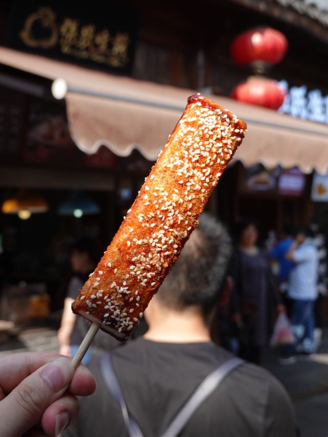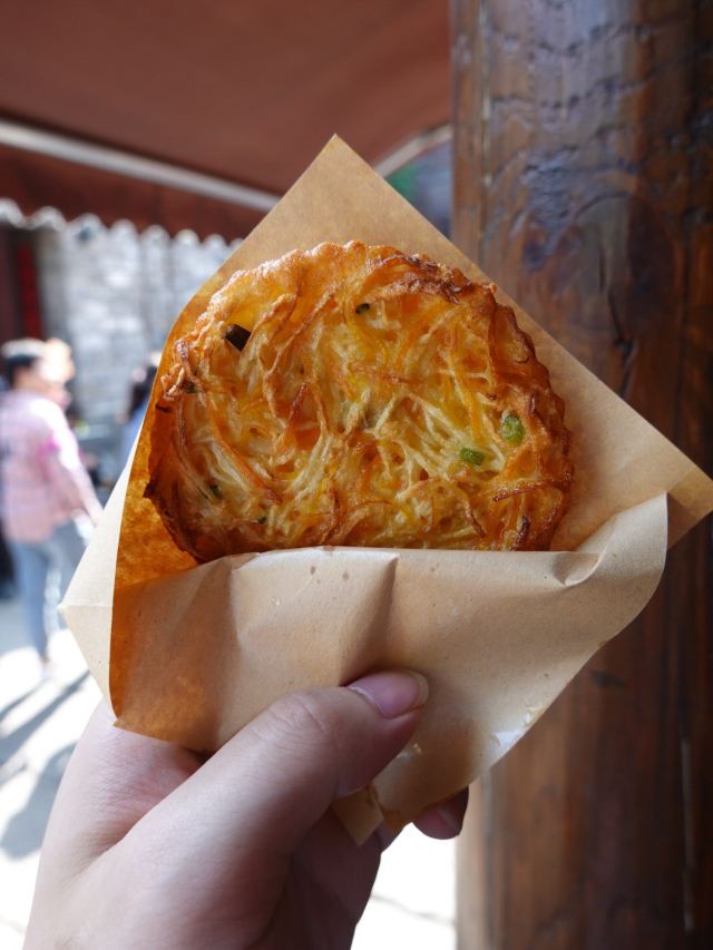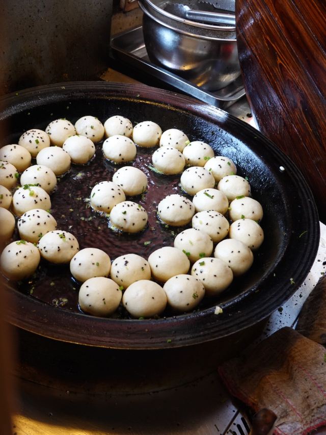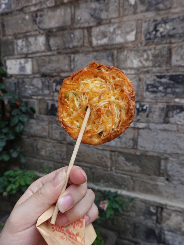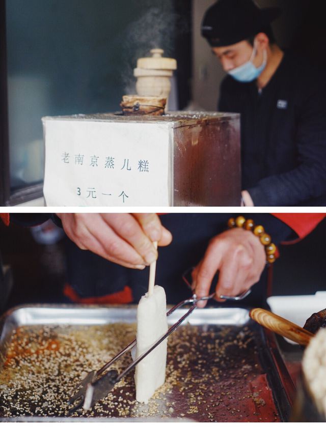 谷春先一路走,吃不停,来老门东必吃小吃,岂能错过! 小鱼锅贴,新鲜出炉的最好吃,涮上特制酱料,撒上芝麻和香菜, 面饼沾着鱼鲜,饼脆味香,酥到掉渣,非常delicious! 张氏生煎,从老门东在就有了,个个形态饱满,色相诱人,底部黄金酥脆。 咬一口,生煎的汁随之流出,甚是鲜美,口感很棒棒! 蒸儿糕,老南京记忆里的专属甜品。米粉压实在木盒里,加上芝麻, 蒸筒冒着热腾腾的烟,等待过程中无比馋嘴。 白嫩嫩的,糕体细腻,一口咬下,满口清甜,一切都刚刚好。 萝卜丝油端子,炸的金黄,纵横交错的萝卜丝,爽脆鲜嫩。 脆皮炸年糕,吃了年糕,步步高升。 人人爱吃,老少皆宜,年糕外酥脆,里软糯,十分可口。