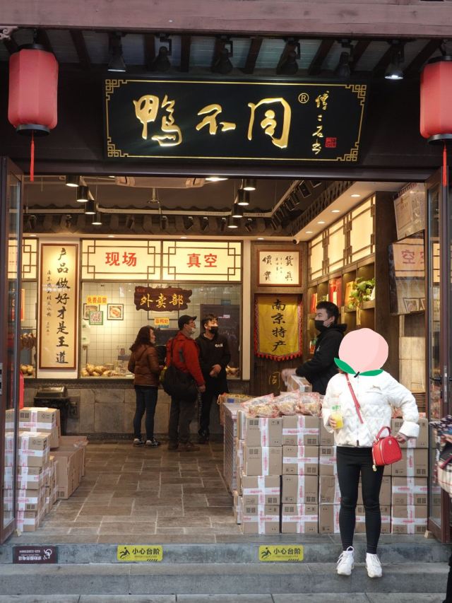 兔小妮同学最近换了新工作,就在夫子庙周边 临近新春,夫子庙也是张灯结彩,夫子庙最好看的时候就是这段时间啦 老听同事念叨夫子庙的鸭不同鸭子店,今天下班去买 排队人很多,一进门就是好多顺风快递的打包盒,对面贴满了快递单,吃的好吃直接快递回家真方便 小哥说已经拖走一车了,还有好多 买了一份鸭子,阿姨现场切,加麻油大蒜,直接吃,太香啦 直接吃的和买了真空打包的都排队了,难在同事念叨,确实好吃,本地人都爱吃 除了鸭子,还有很多鸭子周边,比如鸭四件,鸭子制品,我买了一只鸭,店里小姐姐帮我用漂亮的盒子打包 拎着有里有面! 逛夫子庙必打卡鸭不同,果然没有一只鸭子能游过长江 🙋🏻♂️鸭不同,夫子庙贡院街店(游船码头对面)