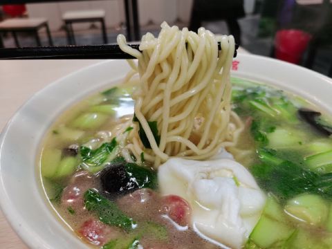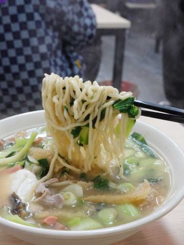 面条是手擀的,很有咬劲;配料真不少,什么皮肚、火腿肠、肉丝、青菜……看着就有食欲;汤头热热的,泼上红红的辣椒油,真是太美味了。一到饭点总要排队,想去尝尝鲜的建议错开高峰期。