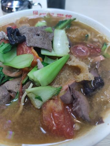 「腰花皮肚面」这家面馆主要是皮肚,最为有名的也是皮肚面,个人觉得老头面和全家福都有太多没必要的东西,就果断选择腰花皮肚面。选了微辣,辣度刚刚好,冬天有一点辣味身体冒汗非常舒服。再来说说本身的面,面还是不错,比较筋道,汤也很浓,辣汤稍微有点微红。皮肚很好吃,很有嚼劲,腰花也洗的很干净,腰皮不是很厚,里面还有些青菜。 [薄荷]环境: 不是很大,中午人还可以,基本上都是与两个人来,大家都在拼桌 [服务铃]服务: 点完等着叫号,服务员会推着小车出来,把面送过来