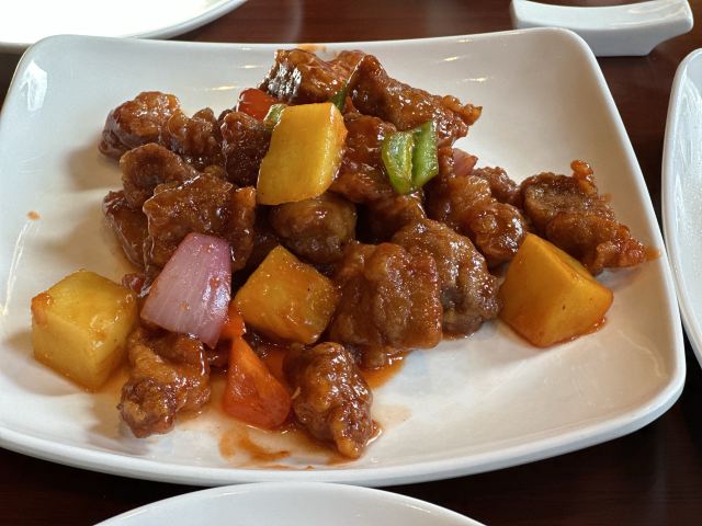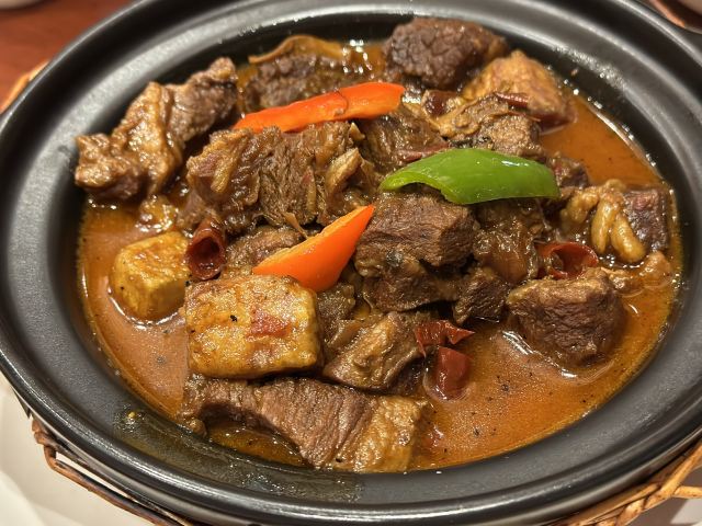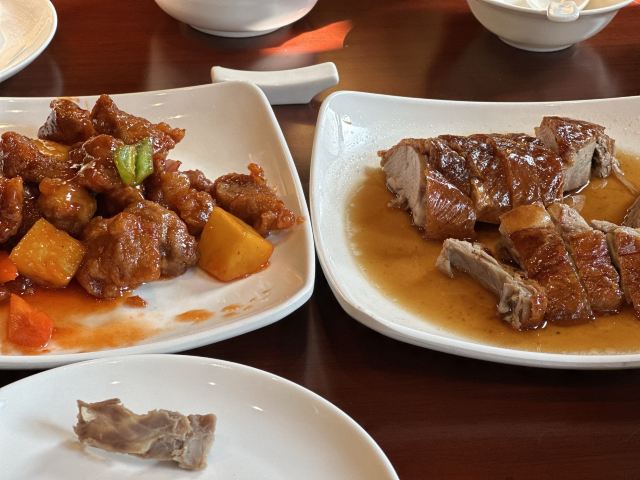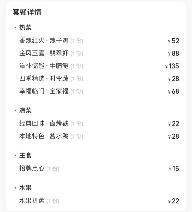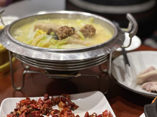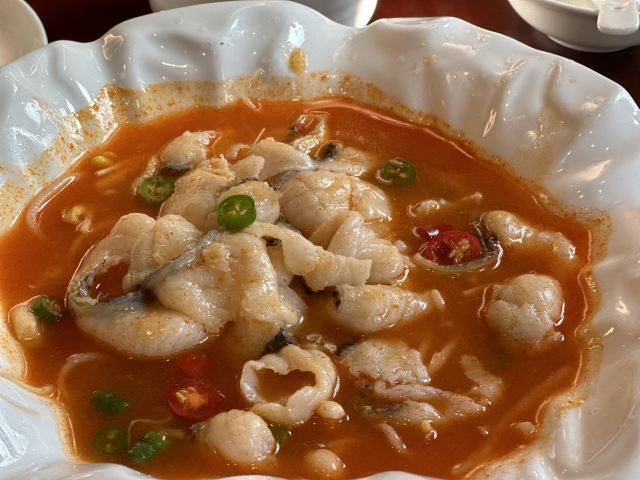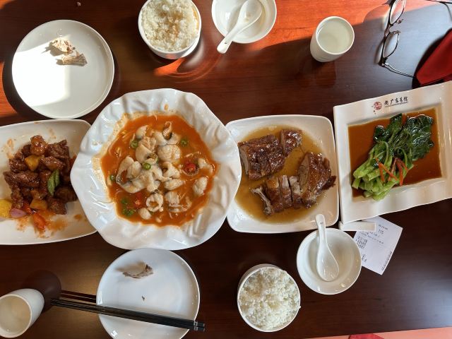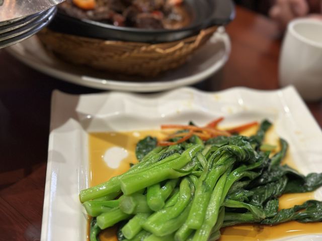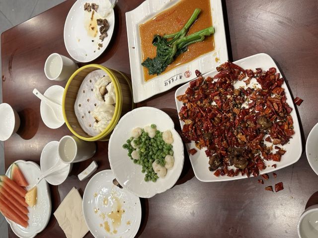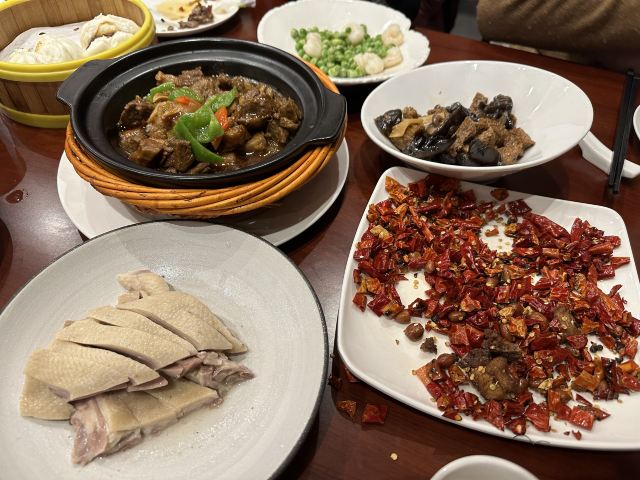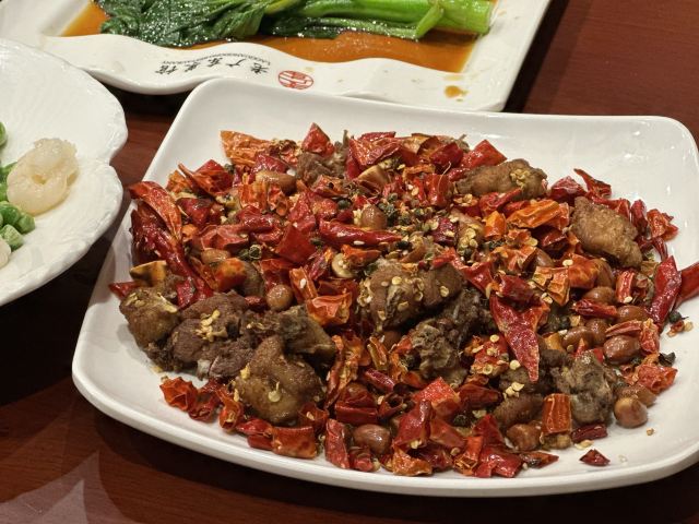 达肥老广东、四川酒家、绿柳居、马祥兴、江苏酒家,现在正餐都是归于古南都集团在做了,所以老国营范儿还挺明显的。 上菜的顺序很迷,这一点和四川酒家、马祥兴非常相近。先上主食,再上炒蔬菜,再上炒荤菜,第四上煲类,第五上水果,第六上汤羹,总之就是随着厨房的心意和灶头的快慢来上,没什么规律。服务员专注于看手机,后厨的白灼广东菜心酱油放多了,服务员一只手端着没端稳,泼了不少在桌布上。不过这种老国营餐厅,还备有餐巾布,而不是餐巾纸,放在红色桌上上垫一下,也能糊弄过去。 辣子鸡非常好吃,不是正大集团和天海藏的半成品辣子鸡,空气炸锅4分钟那种,而是自己炸花生米,自己炸鸡丁,再和辣子汇在一起的现做辣子鸡。盐水鸭也不错,有赖于国营老店的存货老卤。虾仁和豌豆冻得时间有点久,甚至有点臭。牛腩烧鲍鱼的牛腩很好吃,但是鲍鱼个头很小,腥味太大。四喜烤麸和盐水鸭可能都是楼下绿柳居拿上来的,味道一样的。最后的一道杂烩,是我们幼年南京一锅炖的味道,捞里面的鱼丸、鹌鹑蛋、鸡酥、肉圆、蛋饺是个乐趣,不过遗憾的是,除了鱼丸是南通鱼丸,其他都用了批发的半成品,蛋饺皮和馅料分离,也是冻久了的味道。 我觉得他家的凉菜和挂炉更值得吃,因为凉菜来自1楼品质稳定的绿柳居,挂炉烧腊来自1楼的烧腊窗口,这些都是比较可靠的,至于二楼的菜,可能要看厨师和服务员的心情。
