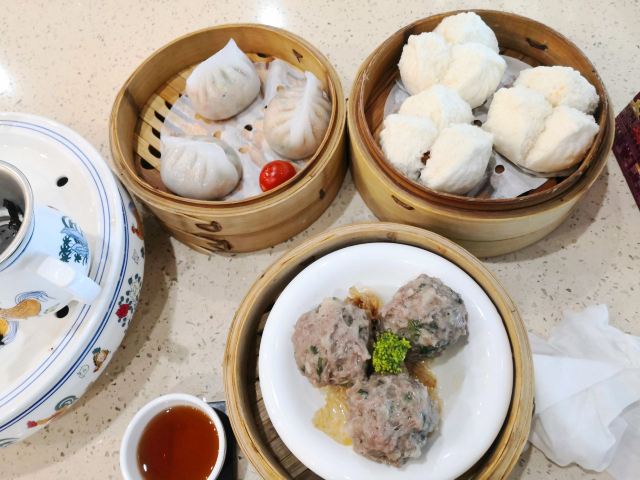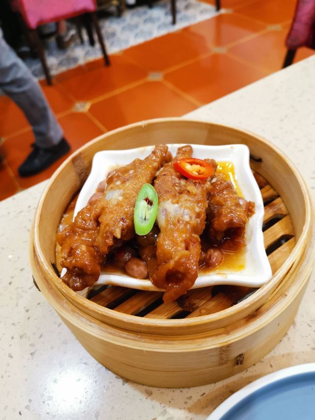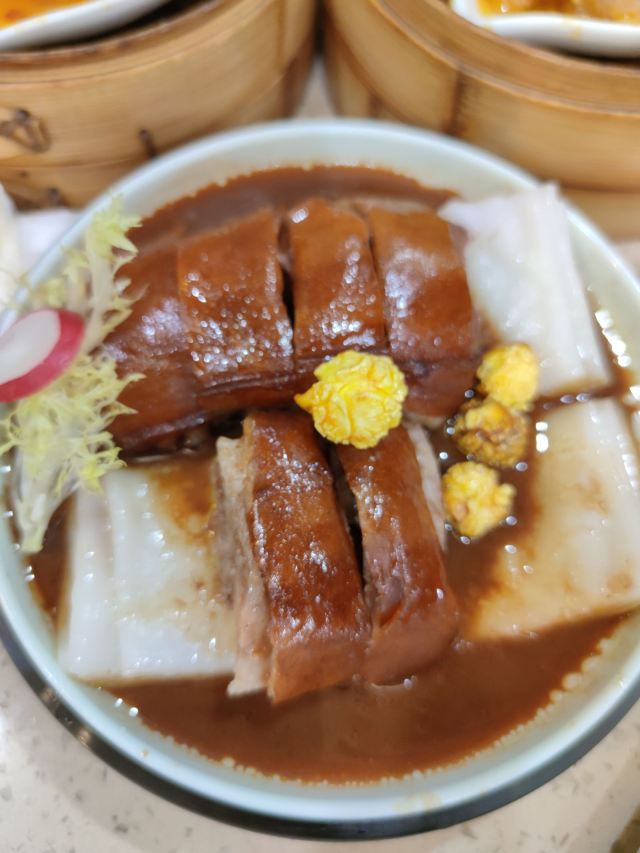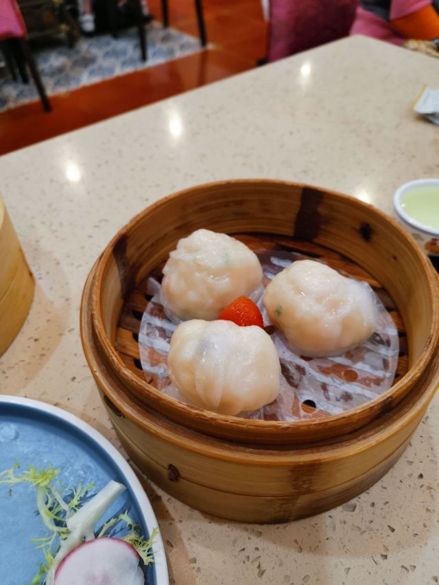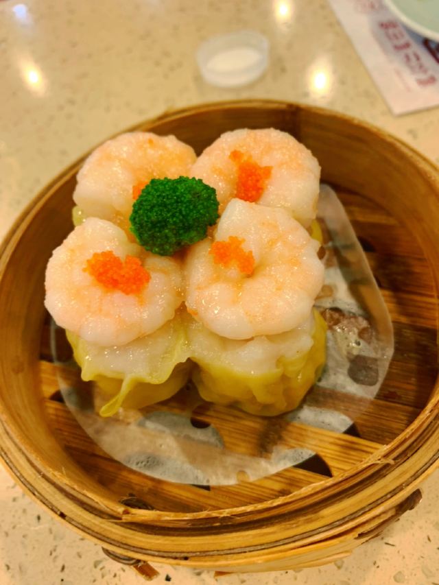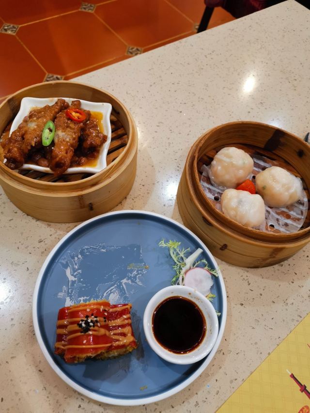 金莎海虾红粉米肠—鲜,金牌虾饺皇,蒸凤爪,荔湾艇仔粥,特色蒸排骨,乳鸽,沙爹蒸金钱肚,豉油皇三丝炒面,蟹籽烧麦,菠萝包