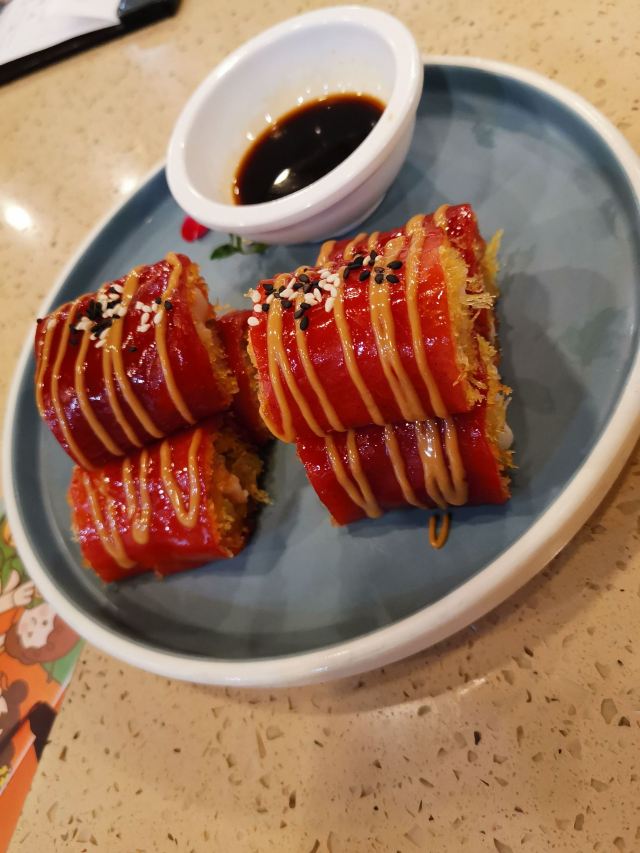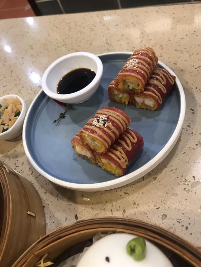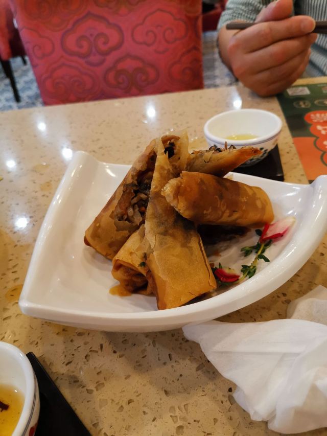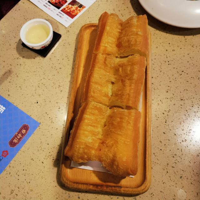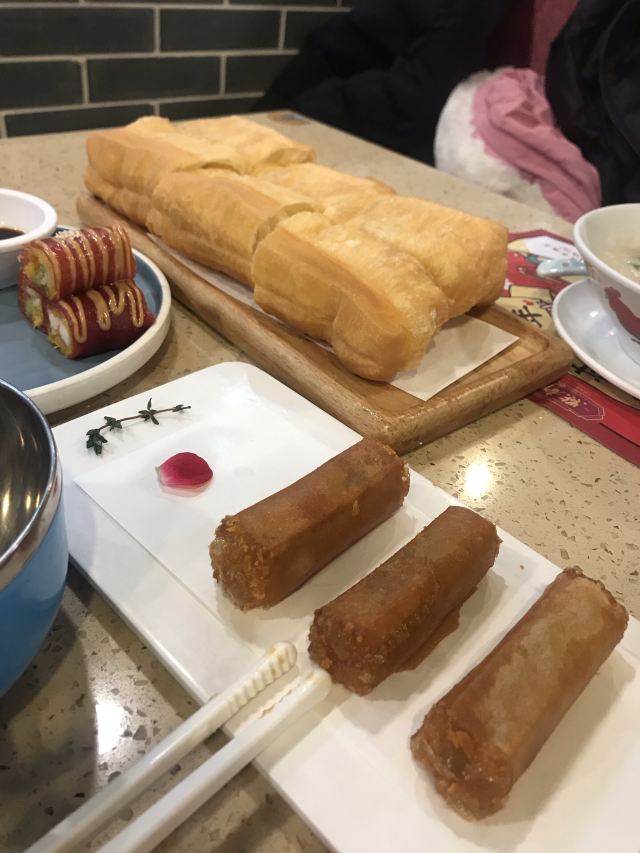 我家宝贝回来了,钦点的点都德,工作日不用排队,直接上客走起。 招牌靓油条,三大块,绵软有韧性又可口,先生说早上有这个油条吃就好了。 金莎脆米肠,他家的招牌,永远不会出错。 鲍汁腐竹金菇卷,素菜吃出了肉味道,不错。 每样都很可口,很幸福。