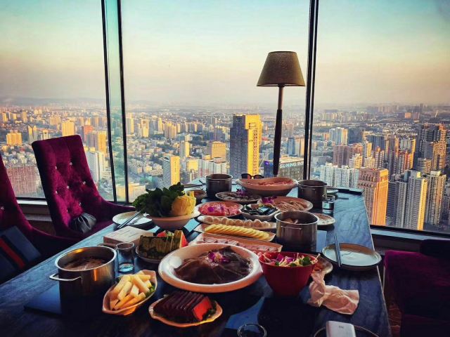 南京最高旋转的餐厅,环境的确是非常好,高层的景观让人心旷神怡,鸟瞰南京城,暖暖的阳光,真的很惬意。尤其晚上坐在窗台看下面就是一道流动的风景。套餐里的食材都很新鲜,就是服务有点差,深水虾量足、新鲜,新西兰羊肉肥瘦相间均匀,很鲜嫩,肥牛拼盘非常棒,两种肥牛都很好吃,而且久涮不老。每种食材都很新鲜,连娃娃菜都是最好部位的。 一家火锅店,位置很高,视野很好,旋转餐厅能俯瞰整个南京。晚餐时间,需订位,食材新鲜,一人一锅方便卫生,环境好,环境好。推荐菜:虾滑。