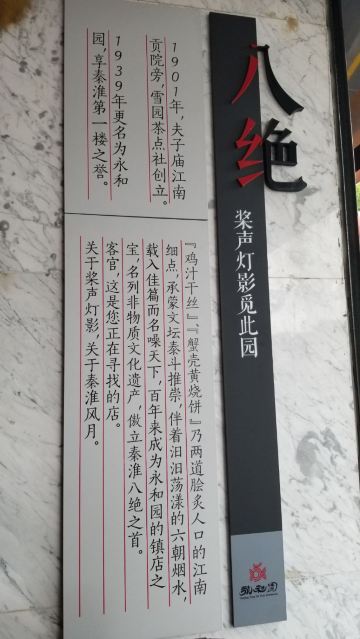 永和园的前身是始建于清末(公元1901年)的雪园茶馆,1939年被改为永和园,经营南京小吃、热菜。他家环境古色古香,蟹壳黄烧饼和开洋干丝味道一流,随着菜品更新迭代,分量比较足的鸭血粉丝汤、微甜的赤豆元宵、皮薄汁多的小笼包饺在也挺受欢迎。