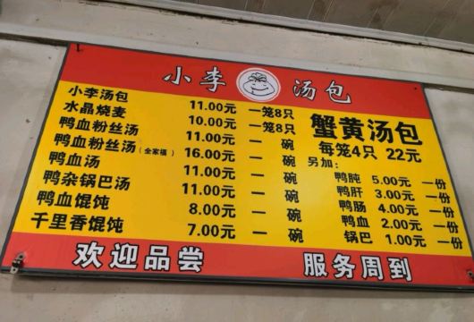 小李汤包,蟹黄汤包,鸭血粉丝汤,水晶烧麦,千里香馄饨,鸭杂锅巴汤,汤汁,鸭血馄炖,鸭肝,鸭血馄饨,蛋皮汤,鸭血锅巴,纯子排面,汤包