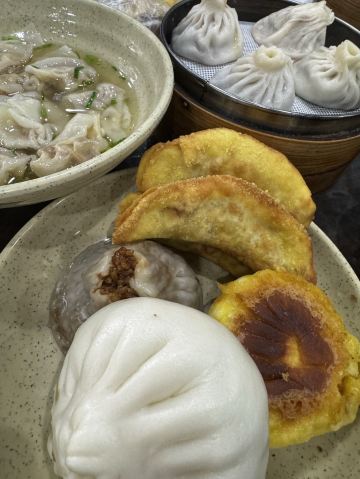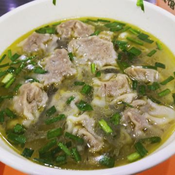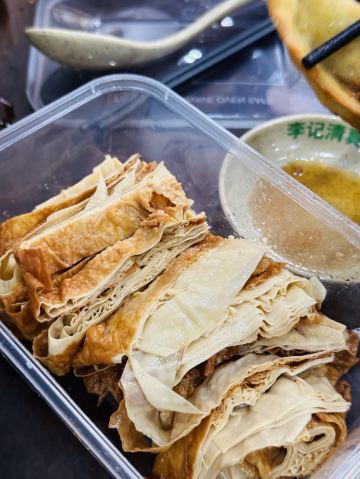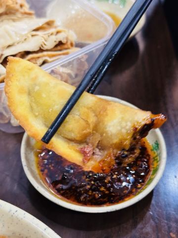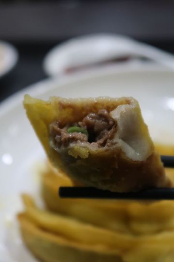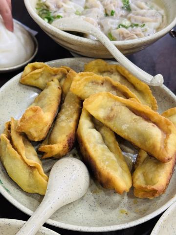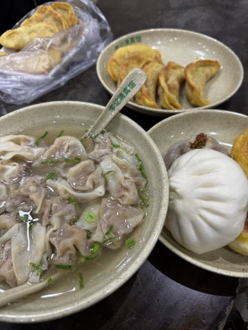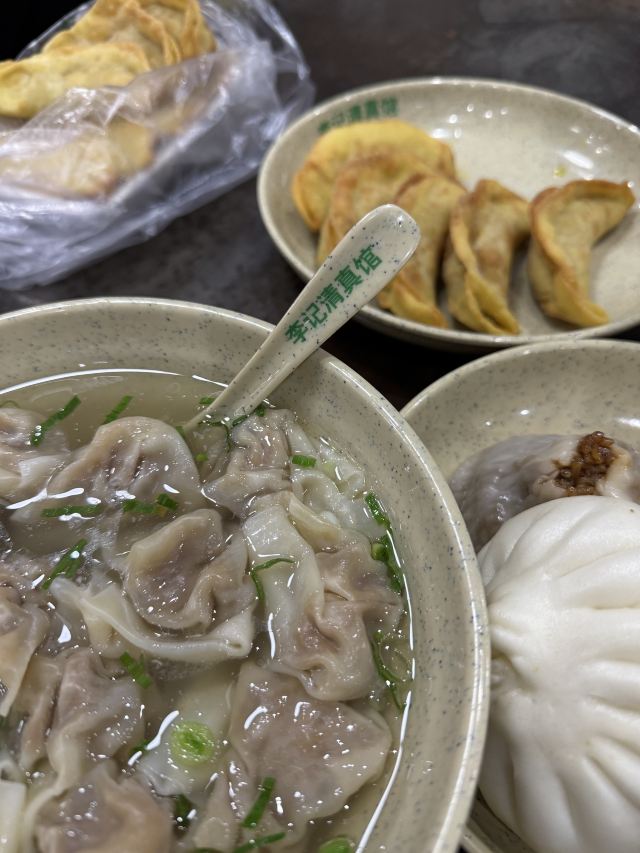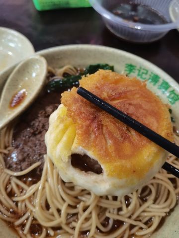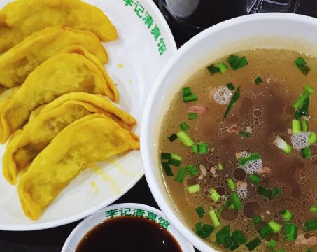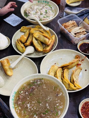 🥟 牛肉锅贴:外酥里嫩,汁水四溢 首先登场的是李记的招牌牛肉锅贴。刚出锅的锅贴金黄酥脆,底部被煎得恰到好处,既保留了面皮的韧性,又增添了几分香脆。轻轻咬开,牛肉的鲜香瞬间在口中绽放,肉质鲜嫩多汁,与面皮的香脆形成鲜明对比,让人回味无穷。每一口都能感受到牛肉的细腻与锅贴的香脆完美融合,简直是一场味蕾的盛宴。 🥣 牛肉馄饨:汤鲜味美,肉质细腻 紧接着,一碗热气腾腾的牛肉馄饨端上了桌。馄饨皮薄馅大,牛肉馅料经过精心调制,肉质细腻且富有弹性。汤底清澈而鲜美,轻轻一口,便能感受到牛肉的醇厚与汤汁的甘甜在口中交织。搭配上一碟香醋,更是提升了整道菜的口感层次,让人欲罢不能。