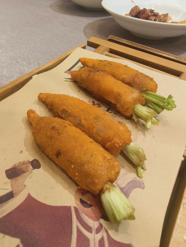 迪斯卡沃先去了「苏香园鱼馆」,店面挺普通的,是看到知乎上有人推荐,大厨据说之前是国宴厨师。但是在出发途中,突然发现点评上有人说上月底老板已经把铺面转让,原班厨师都离开了。 也不知道是真是假反正就去吃了,试了特色菜蟹黄炒蟹腿、卤猪手和满口清香。前两个都挺一般,蟹菜有点腻,也没吃到什么蟹肉。满口清香是用饼皮加上菜和干炸土豆丝包在一块,用醋拌香菜做主味