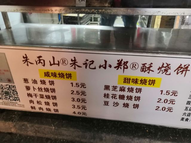 梅干菜烧饼,葱油烧饼,鲜肉烧饼,黑芝麻烧饼,豆沙烧饼,肉松烧饼,萝卜丝烧饼,桂花糖烧饼,咸味酥烧饼,小郑酥烧饼,甜味酥烧饼,豆沙,猪肉烧饼