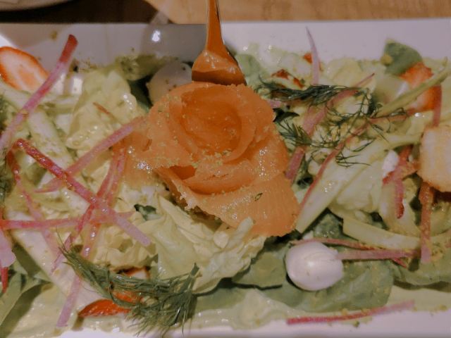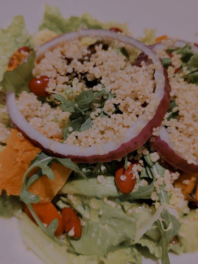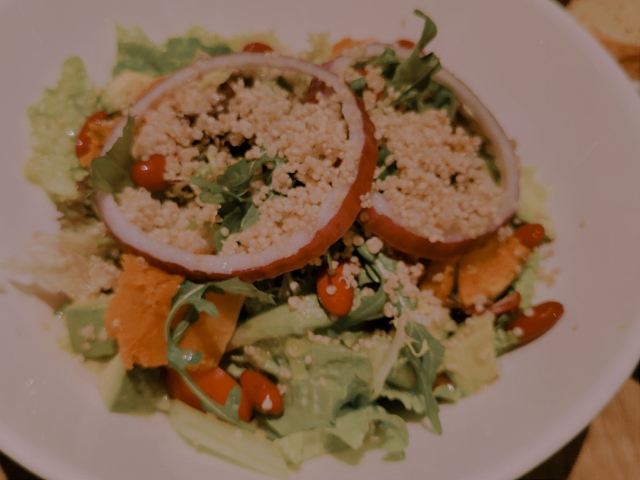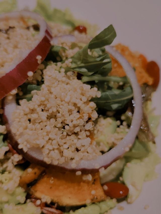 希措其实我还在犹豫 要不要写的这么真实 这么难吃但可以开这么久应该有道理 后来想想 主要是因为她的选址吧 都是比较好的商圈。。。 怎么说呢 就是冬天 晚上 尽量不要选择这种轻餐饮 吃的我越吃越冷 关键东西还没啥 |烤南瓜牛油果时蔬沙拉^底下都是圆生菜和散叶生菜 所以表面的虚假繁荣还是做到了 我觉得也不是不可以 但一看价格就觉得不太可了 中间有个三文鱼的那个 是他们的春天限定还是特推款 相信我!!?千万不要点!!!特别难吃 如果时蔬沙拉的难吃放点油醋汁还能勉强吃吃的话 这单春季限定无药可救 鱼是鱼 菜是菜 酱是酱 不说相似吧 可谓是一点关系没有 然而 大厨还把他们巧妙的搭配到了一起。。。 就是 除非以后有人付费 否则我觉得不会去得一家宝藏品牌