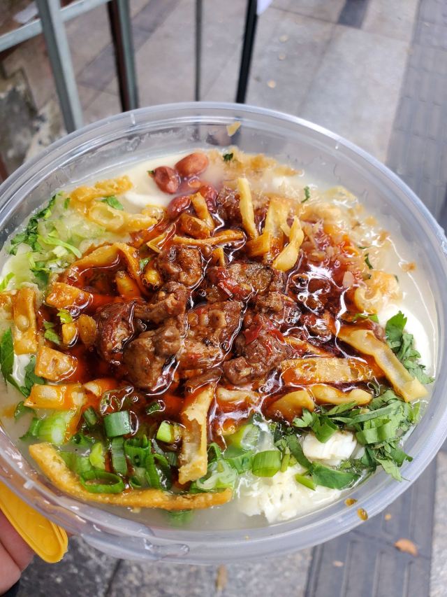 旅游度假建设路吃小吃的一天。停车正好停到他家门口,决定就在他家吃一碗牛肉豆腐脑。场地很小,可能只有2平米左右,街沿上面摆了几张座椅,可以坐下来吃。豆腐脑分量一般,味道也一般,价格有点小贵,12一碗。老板还卖牛肉卡饼,不晓得味道如何。