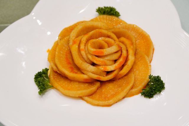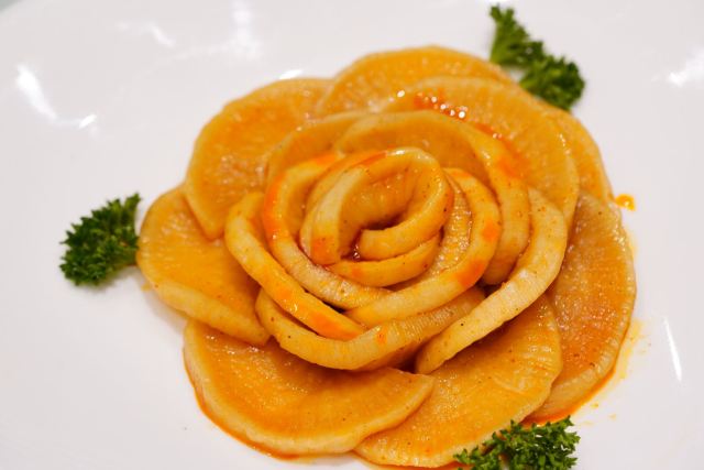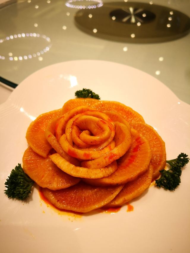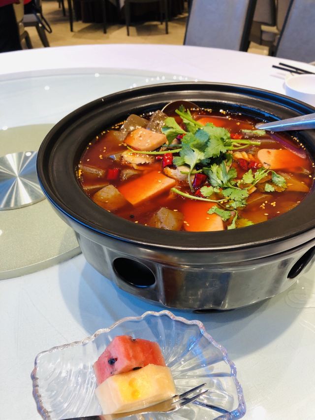 千嶂千澜#2020·眉山吃·游#No. 16——马旺子餐厅 以前来眉山的时候,就曾经来过马旺子。这次又来马旺子,总体感觉不管是餐品还是服务,都是更上一层楼。 我们过来的时候刚好是春节前,正是单位公司年会的高峰期。即便是中午,整个餐厅也几乎座无虚席。感觉对于接待我们这样的散客,餐厅应对比较成熟,流程也很清晰。一楼的接待员在食客等位的时候,就帮忙点菜,节约了等待时间。不过,午市到一点三十结束,之后就不再继续接待了。 很巧的是,我们这次坐的大桌,就是几年前和老爷过来坐的是同一桌、同一个位置,哈哈哈。当时某公司正在搞年会,顺便免费看了变脸和歌舞表演,O(∩_∩)O哈哈哈~ 来说说菜品。 【酸辣萝卜】是马旺子的看家菜之一,造型漂亮,味道好,爽脆可口,些微的辣味很开胃下饭。 【鸡肾旺子】是鸡肾与血旺一起烧出来的,家常豆瓣味。鸡肾口感嫩滑,不会像脑花那样,让人觉得油腻上头,与血旺还蛮般配。这道菜下饭、下面食都是不错的选择。 【脆皮粉蒸肉】算是一道创意菜了,粉蒸肉是肉粒,就像是包子馅的那种感觉。虽然创意可嘉,但味道比较一般,外皮有点干涩,内里是有香菜的。 【手工银丝卷】曾经在太古里的马旺子里吃到过,当时就很喜欢。眉山马旺子的味道也很好,能吃出来是发酵到位的面,口感松泡又不失嚼劲,而且还可以点半份,适合人少的场合。 另外,马旺子的免费泡菜是老泡菜,味道很棒。 眉山马旺子的服务很好,从一楼的接待,到席间的服务员,无一不是热情友好细致,免费水果和雪菊茶也都是加分项。虽然价格不算低,但整体还是很推荐的。