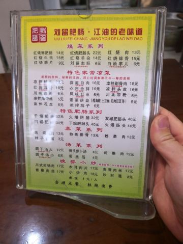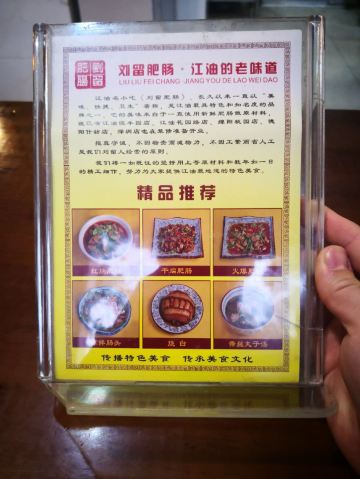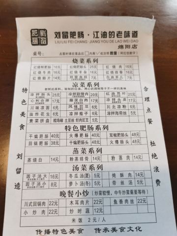 JIANG YOU LIU LIU FEI CHANG MIAN YANG DIAN快闪绵阳,除了把该办的事情办了,还抽空逛了逛绵阳,来绵阳,有三件事是必须要做的 那就是 爬一座山,富乐山, 嗦一碗粉,开元米粉。 吃一顿肥肠,江油刘留肥肠 找绵阳美食排行榜,这家排名第一,那就直奔这里。快速解决晚饭,回成都。 寻店面,好找,店招醒目! 到门口,好停车,方便! 看菜单,价格比成都便宜。 点几个特色试试看。 剔骨肉,20元,这个是我最喜欢的,红油很香。有很多我喜欢的脆骨和筋。鲁迅说过,骨头缝缝的肉最香,是真的。 烧肥肠,口感有嚼劲,和土豆烧是我非常喜欢的。喜欢吃非常大小伙伴一个人干掉一大份。 圆子汤,小份4个,大份8个,个头大,肉质有弹性。有点像家里做的园子。搭配的海带丝丝。可以无限量续汤哦。容器非常可爱呀。 再加了一个素菜,米饭。 4个人一共花了98元,人均不到25。小伙伴说下周来绵阳继续吃这家。 抹干净嘴,回成都。
