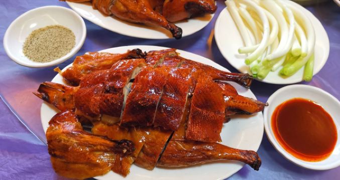 松叶烧鸭,松毛鴨,虎皮青椒,凉鸭胗,烤鸭