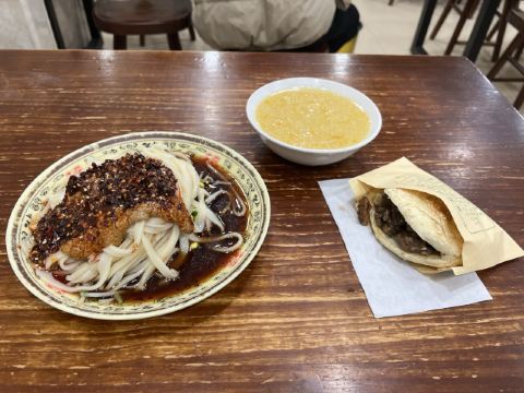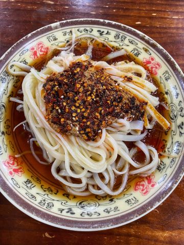 路过安康下高速找了一家酒店休息,晚餐去寻找安康特色美食蒸面,出租车司机推荐了黄家蒸面。我们二人点了两种面,比较后个人比较喜欢吃白色的这个蒸面。蒸面小份的一份是5元、中份的7元,我们点的小份的,肉夹馍可以不点只吃蒸面就完美了。