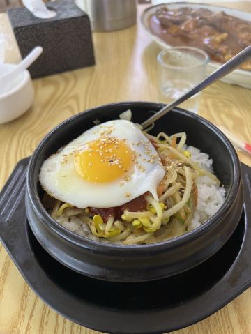 这家餐厅离美人松空中廊桥不远,走走看到一片餐馆就是了,店面挺大,看样子还有二楼,估计是包间。点了石锅拌饭,明太鱼和石板鸡蛋,除了石锅拌饭,其他以前都没有吃过。明太鱼是朝鲜半岛的一种海鱼,蒜瓣肉,应该是先煎过,再浇的酱汁,咸中微辣,还有一点甜,挺好吃;石板鸡蛋,是在酱料上窝的鸡蛋,老板说是秘方,很独特,很下饭。 石锅拌饭用的团购,其他两个菜价格也不贵,性价比也ok,推荐