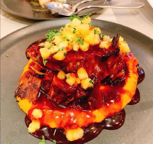 烤三文鱼,牛排,烤羊肉,烤小羊腿,炖蹄髈,烤鱿鱼,大虾荞麦面,椰子雪糕,希腊沙拉,青豆酱烤扇贝
