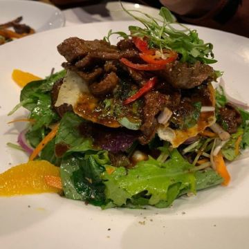 牛肉沙拉,烤猪腩配时蔬,鱿鱼圈,椰汁米饭布丁,炸春卷,奶油煮青口,新西兰牛肉,绿贝