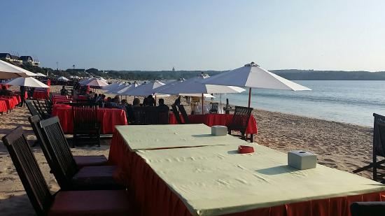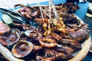 Jimbaran Bay Seafood在巴厘岛尝海鲜,就要到金巴兰海滩的夜晚海鲜摊子去吃,金巴兰海滩是个看日落的好地方,来这里就是吃海鲜烧烤的同时观看美丽的日落。这的烧烤档有很多家,每家都在沙滩上摆着固定的桌位,基本大半个沙滩都被占据了。
