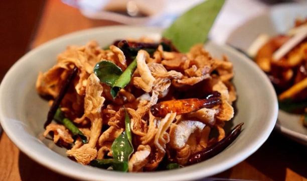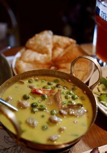 以泰北菜出名,店里的生意超级火爆,很多人是拖家带口来聚餐的。 五层楼的私人楼房,目前只开放三层,门口看起来像是个酒吧,周末挂着happy hour的牌子啤酒买一送一!一楼二楼全客满,我们坐的第三层走道上放映着卓别林黑白无声电影的投影,等菜的时候看一看也很轻松,还有人特意在投影的光影中拍照也很有意思,此外还有一个台球桌,吃饱可以来一杆哦! 特别适合周末朋友家人小聚餐,环境休闲,虽然算不上高档,但也很有气氛,菜品丰富,价格也很优惠[憧憬]