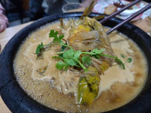 爱玩耍的小妞儿|神仙鸡^分大份、小份,小份有7块,外焦里嫩,尤其是外皮太酥脆了,一般香酥鸡外皮都没这么脆,里面的肉也很入味,颜值和味道并存的佳肴! |白洋淀石锅嘎鱼^三条嘎鱼肉质鲜嫩,放了粉条,鱼汤还可以泡饼,汤带点酸汤味儿很好喝,粉条浸足汤汁特别好吃,最后连汤带鱼加粉条和饼全干掉了,热乎乎一锅太爽了! |白洋淀虾肉藕饼^一般藕盒放肉馅,这个里面放虾肉很创新,藕的清香加上虾的鲜美,味道好极了,而且藕的清热效果和虾的温补作用相辅相成,营养又健康! |骨渣丸子^感觉一般,没尝出什么特色。 |沙煲养生时蔬^有杏鲍菇、白菜、菠菜、茼蒿等蔬菜,味道还可以,就是作为素菜,油放的有点多。 服务: 从等位倒水、落座赠送水果到点菜、买单,处处体现了服务的细节,上菜很快,给服务点赞!