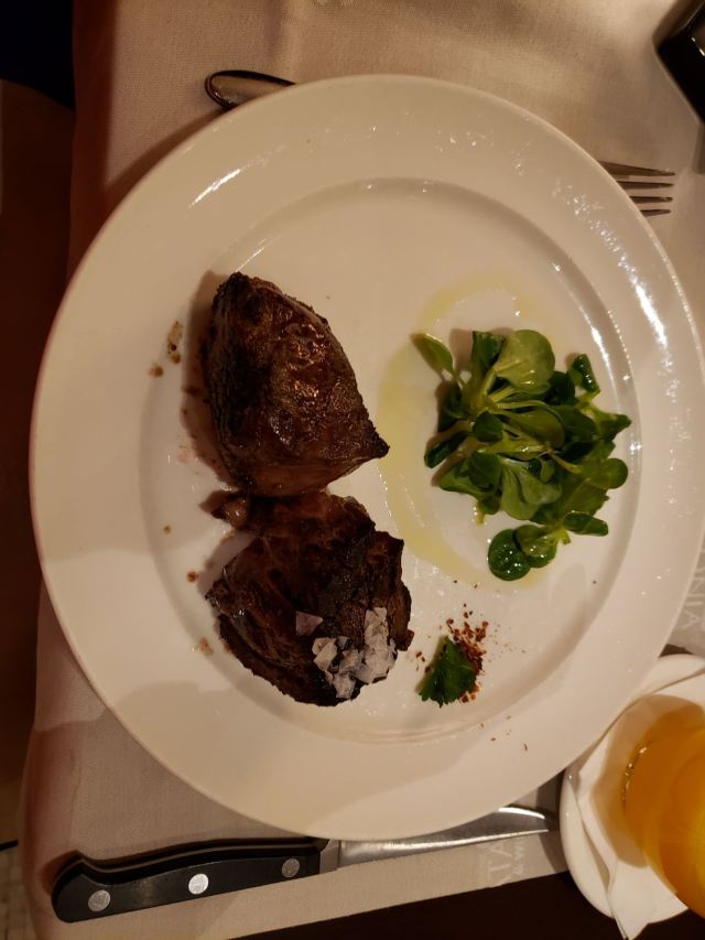 这家餐厅就在我们巴塞罗那酒店的马路对面,网上查到评价不错,于是没有预订直接上门,好在还有空位。 餐厅主打牛排,阿根廷牛排和欧美的牛排在做法上有差别,更焦一点,外香里嫩。点了双人份的rib-eye,medium 5分熟,很棒的口感。土豆配奶油的佐餐,出乎意料的好吃。这些总共不到60欧,性价比很高,这家餐厅强烈推荐。