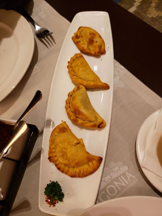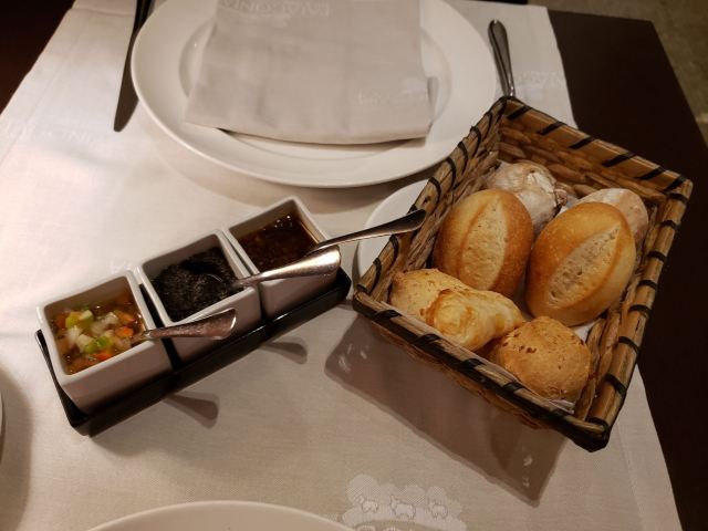 阿根廷烤芝士,餐前面包配橄榄酱,前菜大拼盘,烤猪颈肉,酱料台,牛肉眼,Empanada Salteña de carne,morcilla,Grilled meats,Bife de chorizo,Brochette Mixto,Medallón con salsa a la pimienta verde