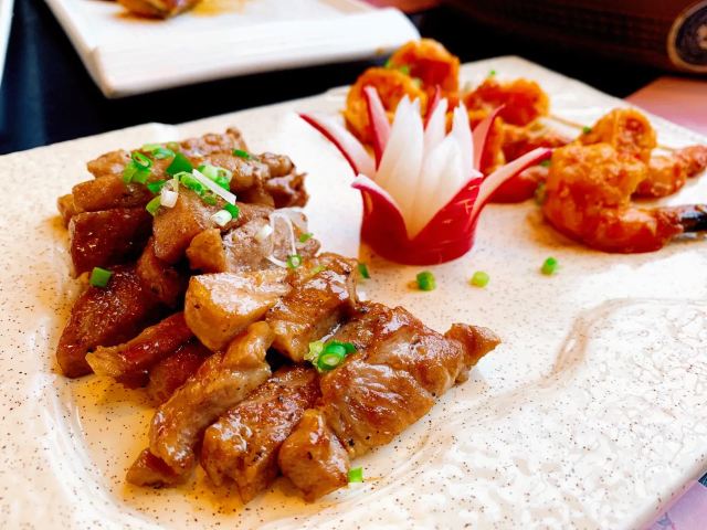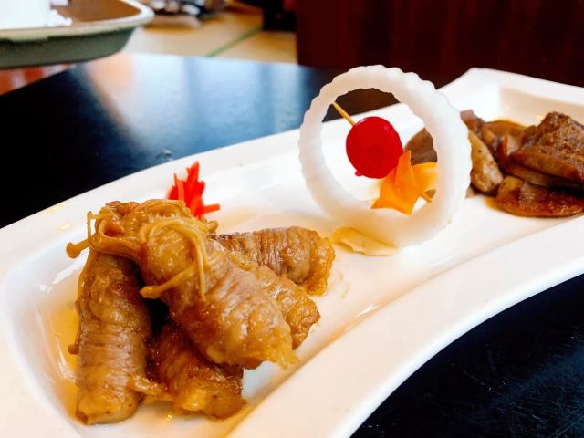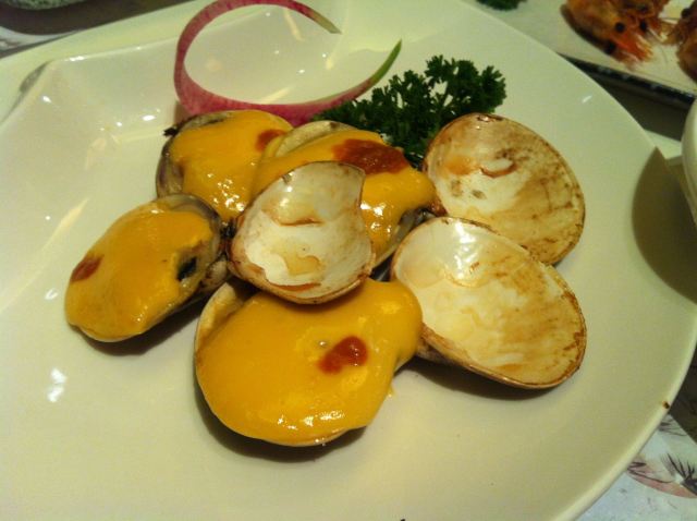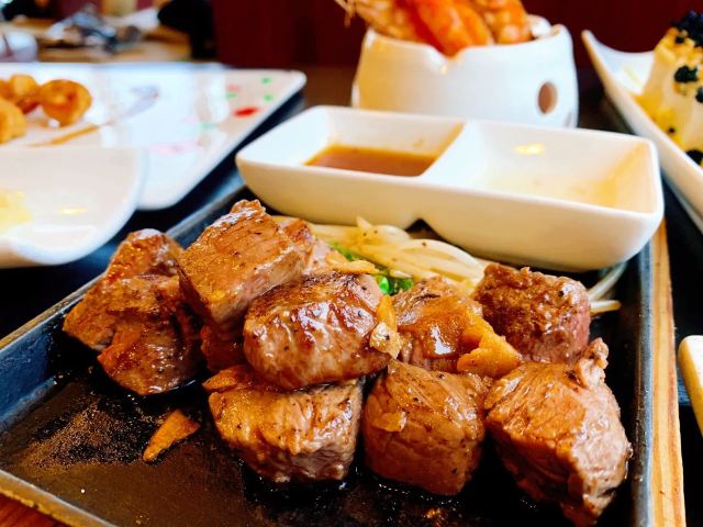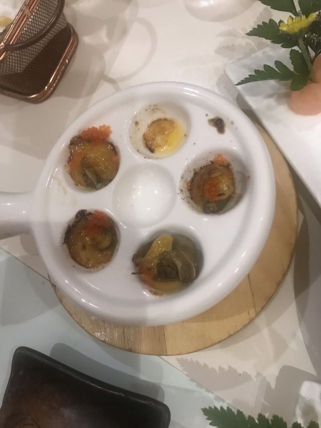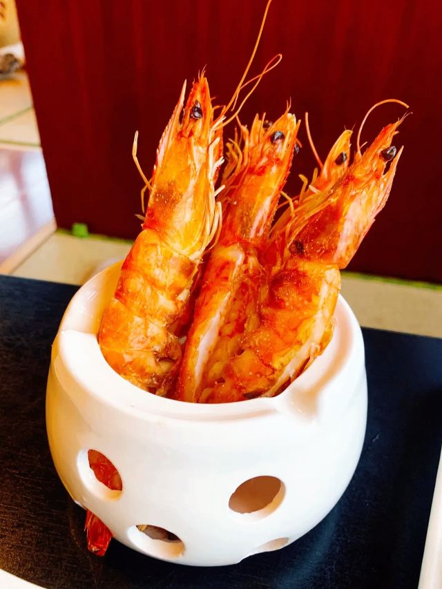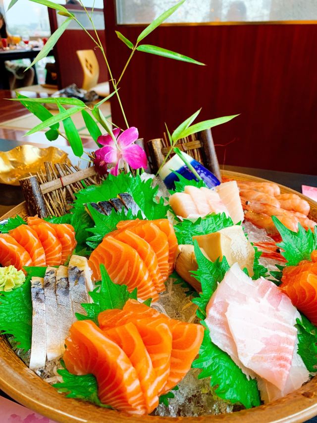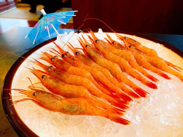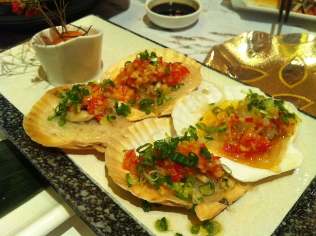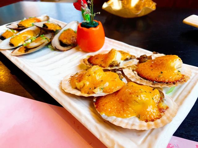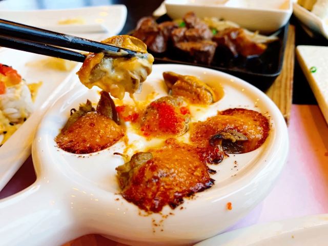 甜虾,美乃滋焗扇贝,马苏里拉三文鱼,汁烤鳗鱼,香煎鹅肝,黑松白鹿卷,三文鱼等刺身,松茸汤,法式焗蜗牛,蒜蓉粉丝蒸扇贝,盐烤车虾