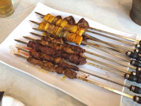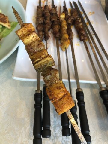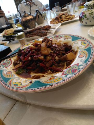 行走的多宝新疆馆子,不大,环境和服务都很一般,菜品还可以,吃肉的话感觉很过瘾。囊包肉,很有特色,囊泡在汤汁里,馕的边缘很脆,里面又很软乎,吃起来很香,肉也够入味儿,一点儿都不腻,但是肉有点儿嚼不动。大盘鸡,绝对是大众口味,鸡肉给的还算很实在,不是那种鸡架子,口感也不错,比较嫩,土豆口感绵绵的糯糯的,配面特别入味软弹,汤汁咸鲜微辣甜,很给力的说。羊肉串,肉量一般,但是肉质确实不错,虽然不是很肥,但是不乏香腻的质感,鲜嫩多汁,还很入味。自制酸奶,很诱人,喜欢喝这种稠稠的,奶香浓厚,葡萄干也好吃,很给力!主食没在单要,大盘鸡和馕包肉里面的就完全够吃了。