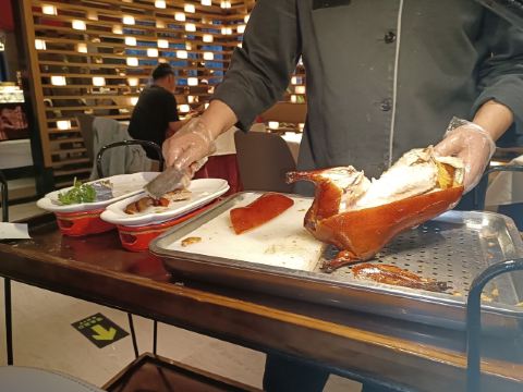 远洋望京北京大鸭梨烤鸭红庙店,烤鸭皮脆柔嫩香气扑鼻,味道独特,必点香酥烤鸭和老北京炖吊子,爱吃羊肉的一定要点他家的贝勒爷烤羊肉。
