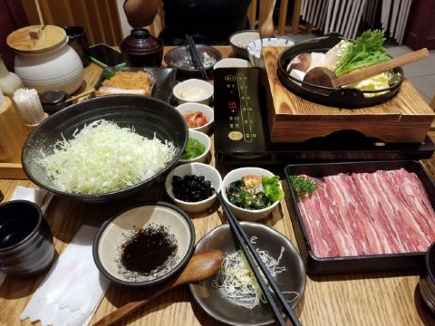 猪排虾排套餐,风味冷豆腐,千层锦猪排,酥炸猪肉裹温泉蛋,里脊猪排,霸王,高丽菜丝,芦笋卷,味增腰内猪排,糙米饭,手磨芝麻酱,炸虾,餐前小菜,芝士猪排卷,味噌汤,炸可乐饼