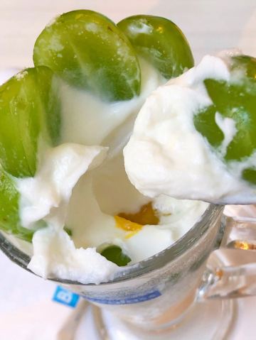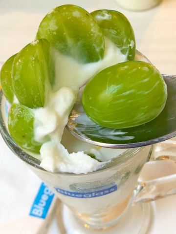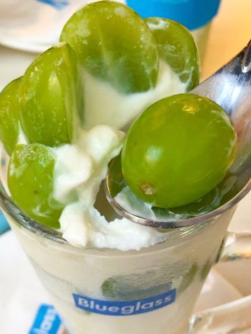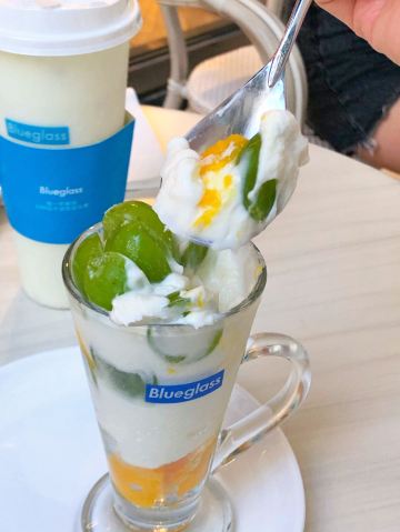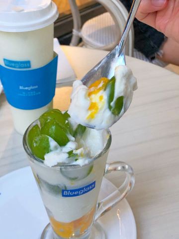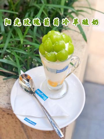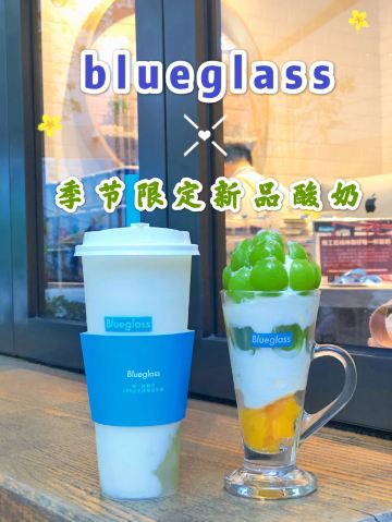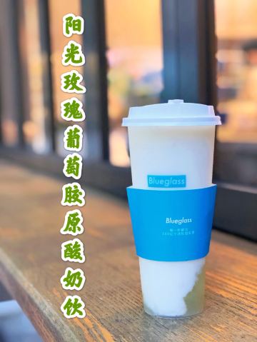 最近blueglass主打阳光玫瑰葡萄系列,简直是花了血本! 科普小知识: 阳光玫瑰葡萄产自日本冈山,碧绿的颜色很夏天,它的果肉口感鲜嫩, 汁水多多,最神奇的是带有淡淡的玫瑰香味。果肉中含有丰富的钙,为人体补充营养物质。 含有一种黄酮类的物质,能抗衰老,清除体内的自由基,对预防心脑血管有较好的作用。 说来也巧,等待的时候店员正好搬了几箱葡萄来店里,价值色香味俱全呢!难怪被称为葡萄界的爱马仕呢! 推荐饮品: 阳光玫瑰葡萄冷萃酸奶 顶部是超级多大颗的新鲜阳光玫瑰葡萄,摆盘很诱人! 中间层是冷萃酸奶。10小时冷萃酸奶在5-8度的低温环境下缓慢萃去而成,整个萃取过程中没有添加任何添加物质,吃起来没有任何负担!我一直追求纯天然的食材,这款酸奶没有任何甜味,口感很像冰淇淋,很醇厚!夏天建议尽快食用。 底部是新鲜的芒果果肉,酸奶本身没有甜味,有了芒果的加持,口味又提升了一个档次!和葡萄以及酸奶一起入口,层次分明,酸酸甜甜就是我! 阳光玫瑰葡萄胶原酸奶饮 比起冷萃酸奶,这杯比较稀薄,没有那么稠,口味偏甜。 每杯含100亿个活性益生菌,配以法国进口胶原蛋白肽、每日新鲜制作乳清蛋白冻。 底部是葡萄果肉和雪燕的融合体,营养价值高,吃起来Q弹顺滑。 这样一杯下肚,30片面膜已做好,嘻嘻! - 性价比 一杯45元,价格其实并不算便宜,但每一杯都是健康美味又富有营养价值,酸奶中的爱马仕绝对是物有所值哦!感觉经常来喝我又能穿回lululemon的最小号啦!