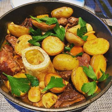 伊來「澳洲纯血安格斯牛菲力」 肉和酱汁杂糅一片,卖相有悖以往。牛排与鹅肝共同出现可以看出店家对食材的自信。 鹅肝幼滑飘香,滑不留口,这也罢了,牛肉的细嫩竟然丝毫不怵,肉质紧实浑然一块,肉色鲜艳勾人魂魄,最妙还是口感,丝毫尝不出红肉的腥酸,酱汁清醇更为牛肉增色添香~ 「南瓜清汤」 一直不喜南瓜汤的黏腻,再三确认店内只有这么一品汤后,也就随意了。不成想被此汤惊艳到,清甜爽快毫不滞涩,喝顺了嘴的时节很是挡口~ 「荔枝慕斯」 荔枝的江南甜风姿万千,轻柔明媚处清晰可辨,鲜甜香润令其它美食相顾失色,当晚甜品第一佳! 「勃艮第红酒炖牛肉」 吃这道菜时,菜已经凉下去了,恰巧放置的过程令牛肉吸收了更丰富的汤汁,拎起一块酣畅淋漓,洋洋洒洒,入口滋味独特回味悠远~