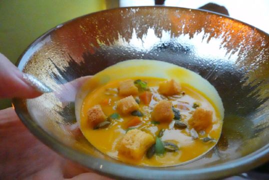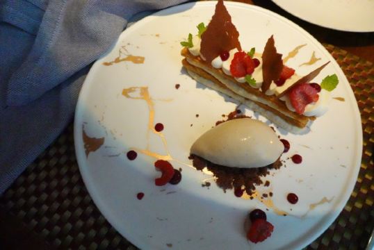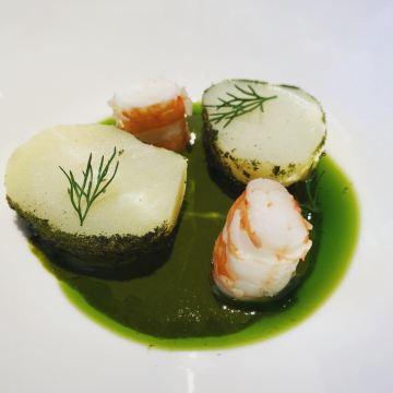 artistfx1118【口味】「勃艮第红酒炖牛肉」土豆炖牛肉的感觉,味道还是很的,牛肉很软,肉确不散,小土豆也很软,还有骨髓,味道很好「法国布列塔尼蓝龙虾」味道很好,四块龙虾很精致「加拿大扇贝(4年生长期)」扇贝个头很大,配了面筋和米粉,很有中式吃法的感觉「鹅肝三重奏」有鹅肝慕斯,还有底层配有鹅肝酱的类似饼干的食品,味道都不错,鹅肝慕斯更是很醇厚的口感「法式传统千层酥」甜品,千层酥配冰激淋「餐前面包」有两种,一种全麦,一种普通,配着「自制黄油」味道还是很不错的「土豆红虾」很好吃,算是酒店送餐前小菜,味道很精致 【环境】[薄荷]环境: 很小的店 【服务】[服务铃]服务: 还可以,法餐的节奏,服务员会介绍每道菜品