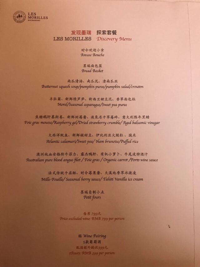 灵心小榭赏味鹅肝菜式吃过不少,今天在这里第一次尝到一款脆皮鹅肝慕斯,口感令人惊艳。 外面的脆皮很酥脆,上有冻干草莓和蜜渍橙皮条,整个鹅肝小食吃上去细致而不油腻。 这是餐厅799元9道式探索套餐中的一道前菜,套餐对一位女士来说份量有点儿大,如果不想点全套,「脆皮鹅肝慕司」是值得单独拔草的菜品 [环境]餐厅不大,四人的小方桌有8一10张的样子,氛围还是挺适合约会的。人气8错,中午的时间,我到得早,到开始用餐时,店里竟然上座了大半。 点了探索套餐,加399元,试了选配的5款酒。 第一道酒,「智利espino霞多丽干白」迈坡谷的霞多丽,经过橡木桶熟化。开始觉得作为第一款酒有点儿厚,后来发现要配到欢迎小食、汤 、蔬菜三道菜,还是需要些酒体的。 「欢迎小食三拼」包括米饼 泡芙 虾肉,虾肉鲜甜,还有些油浸的香味。 「夏季欢迎小食」桃子、番茄和罗勒酱,喜欢! 「南瓜汤」是南瓜清汤、南瓜泥和南瓜丝的结合。我认为不应该称它为南瓜清汤,也不能称作南瓜浓汤,有特别浓郁集中的南瓜香气,很绵细,不稠厚。是我近几个月来尝到的最好喝的南瓜汤。 餐厅的名字Morilles是法语羊肚菌的意思,可见羊肚菌是它家的招牌,也能代表主厨的某些烹饪理念。羊肚菌需要精细用心的清理,食材本身的品质很重要,而如果没有好的烹饪技巧的加持,羊肚菌容易显得韧而寡淡。这道「羊肚菌绿芦笋配新西兰甜豆泥」则很好体现了食材的鲜甜,菌肉厚实清香,没有丝毫沙尘。 第二道酒,德国「Vackenberg酒庄雷司令干白」,原本以为它配鹅肝会有点儿轻,配后发现,这款雷司令的柑橘水果味道蛮鲜明的,和鹅肝脆皮外面的水果粒风味可以相互映衬。 第三道酒 「cote mas酒庄干白」是朗格多克的地区餐酒,瑚珊、玛珊为主的混酿,简单轻盈。 海鲜主菜「大西洋鱿鱼」富有弹性,柔嫩略有不足。 第四道酒 比较热情饱满的「御兰堡酒庄设拉子干红」。 肉类主菜「澳洲纯血安格斯牛菲力」想吃嫩一些的,要了三分熟,感觉质感控制得可以。主菜还包括一份鹅肝和波特汁牛尾,丰腴入味。 第五道酒「托卡伊贵腐酒3p」 甜品「法式传统千层酥」手工开酥,酥脆及浓郁的黄油香,好吃,但确实有一些心理负担,同伴选的「荔枝慕斯」就让人松弛了许多,里面的荔枝肉和蓬蓬纱一样的轻盈的奶油,都很夏天。 尝了口同伴单点的「油封鸭、20年老菜脯、心里美」,煎比目鱼也很赞。
