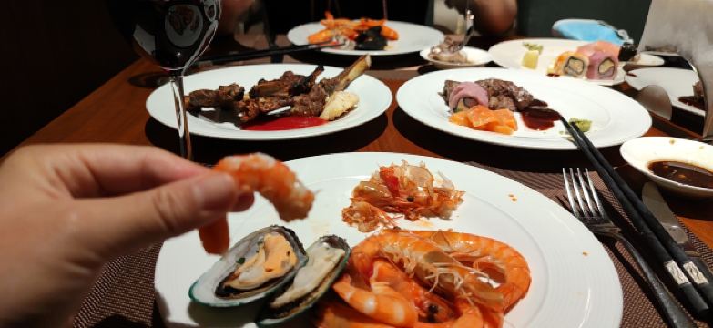 烧烤羊排,三文鱼铁板烧,基围虾,提拉米苏,BBQ烤排骨,匈牙利烩牛肉,羊蝎子,巴斯克炖鸡,鱼生,乳酪蛋糕,水果,冰激淋,时令海鲜,甜品点心,三文鱼刺身,烤牛排,螃蟹,海鲜大蒸屉自助晚餐