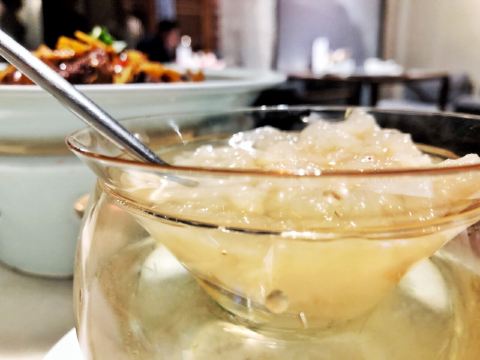 提前预定 结果远途来的朋友晚点 看着外面等位的食客有点不好意思 就出去逛街让给她们先吃 八点多再过来就直接入座了 「老上海熏鱼」熏鱼非常棒 甜口却不腻 鱼肉很入味 经典的一道前菜 「无锡烤菜拼蟹钳」蟹钳太爱 醉蟹做法 爱不释手 「响油鳝丝」也是经典的一道 鳝丝入味 但后面有点咸 配米饭正合适 「脆笋烧牛肉」脆笋比牛肉更适合这个季节 时令的东西 我喜欢 「蟹肉炒芦笋」芦笋很嫩 清炒蟹肉 开始看起来以为是虾仁呢 「朱桥甲鱼羹」甲鱼羹开口并不喜欢 后面后味却不错 「葱油拌面」好吃 就是凉的太快了 一个人光盘 东北胃的朋友非要吃米饭 「木瓜雪蛤」两杯都让东北胃的朋友干掉了 服务很好 最棒的迎宾是门口的鹦鹉 一劲儿说你好你好 可爱