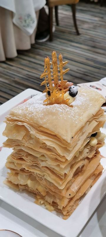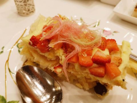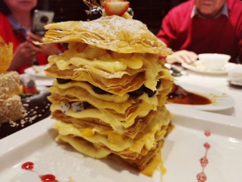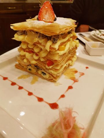 空空游记北京有名的拿破仑酥 排队超过一个小时都不在话下的餐厅 🌈位置 王府井大街269号王府中环东楼4层 🚞出行方式 地铁一号线王府井下 🌿环境 面积超级大,很富贵厅堂 搭配的不是轻音乐 是嘈杂的洗盘子声音 落盘子,码盘子声音很大 感觉跟这里的装饰格格不入😱😱😱 101鲜果拿破仑^ 1⃣️酥 每一层黄油,每一层面都是那么酥 脆得不行不行,感觉很棒👍🏼 2⃣️新鲜 水果很多,蓝莓,芒果,黄桃等等 每一层一个样子,很不错 3⃣️甜 味道偏甜,口感还可以 👫服务 收取10%服务费 在切食品时告诉我,您剩下的食品也可以自己切 请问服务费体现在何处? 不知道哦,也许我这种没有见过大台面的人理解不了