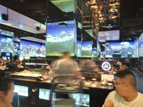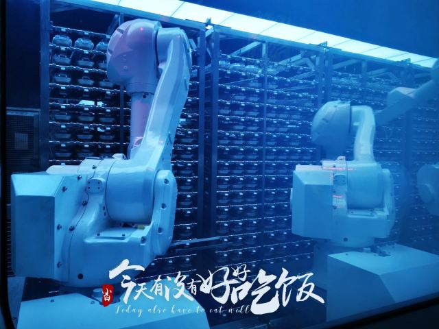 终于终于拔草了海底捞智慧餐厅!很有惊喜感! . 入门的等候区域,没有了美甲和擦鞋服务,换成了一个“电影院”区域。等候区域设置了一块类似电影院的区域,拥有一个十几米长的显示屏,客人在这里玩海底捞自己研发的小游戏“吃货大作战”,下载海底捞 App 扫描屏幕中的二维码就可以一起玩游戏。大屏幕的右下角会实时显示排号和部分餐厅后厨的工作状态。 . 通过等待区域,可以通过透明玻璃窗看见里面的机器人备菜的过程。一份份菜品摆在货架上,机器人通过操作为餐厅提供服务。玻璃窗下面还有一些显示屏,循环播放机器人备菜的操作说明,很有意思。 . 整个用餐区域像一个超大的宴会厅,唯一不同在于四周被显示屏包围,循环播放一图案,为用餐提供不同的氛围感受。 . 餐厅一共有6台上菜机器人,机器人也是随机服务。并不是每一桌都由机器人上菜,但是如果对机器人很感兴趣,服务员会把它召唤过来。机器人走到客人桌前会说话,这时候还是会服务员来端菜。 . 其实海底捞还是那家海底捞,服务依旧高水准。觉得是一家非常适合带家长和小朋友去体验的黑科技餐厅。