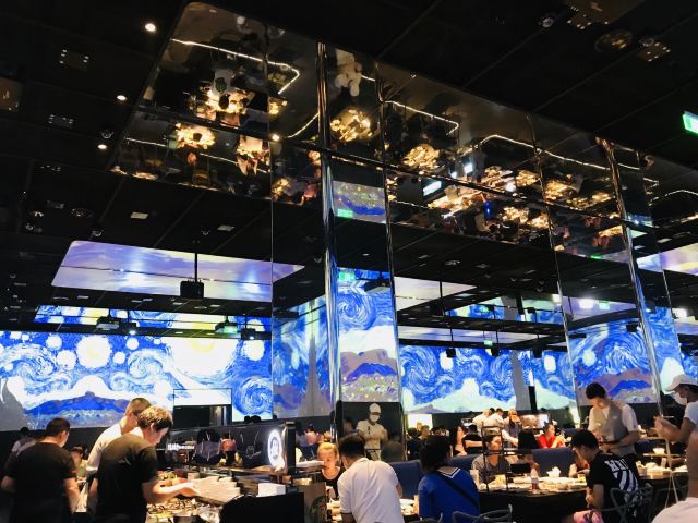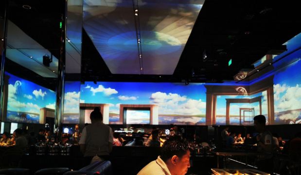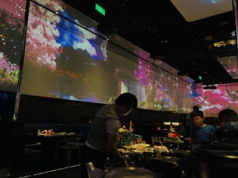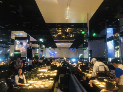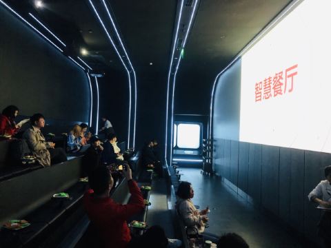 餐厅设有太空、雪山、宫崎骏动漫、樱花四种主题场景,360度的展示带给食客丰富的视觉体验。透过玻璃可看到机器人分拣菜品,干净有序,送菜方式打破常规,采用智能机器人送菜,等位区更是设有大屏游戏,让等待过程也充满趣味。