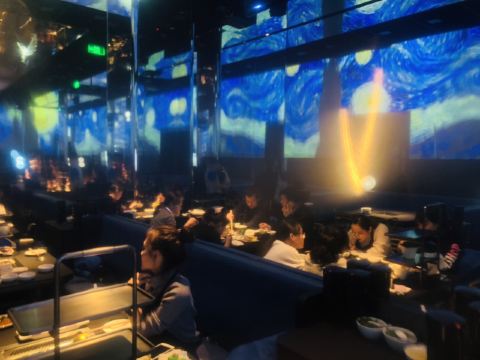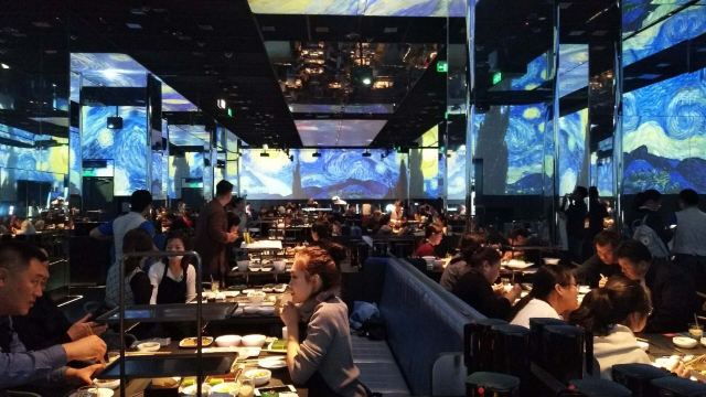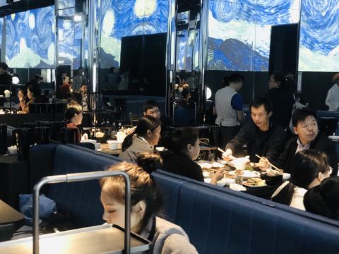 中骏世界城的海底捞,号称全球首家智慧餐厅,餐厅内的送餐机器人满处跑,在2018年看来可是太神奇了,重金打造的天幕仿佛天文馆,置身其中,感觉无比神秘。在这儿涮羊肉,吃一口会不会人脑变电脑? 【排队】工作日中午去,有24人在排队; 【环境】等候区的暗黑影院、就餐时的天文馆加艺术馆都凸显着这里的与众不同,当梵高的星月夜亮起时,全场叫好; 【菜品1】  菜品名称:草原羔羊肉  价格¥46 ·羔羊肉最注重肉质的选材与排酸; ·与别家不拘小节不同,他们家不光选料好,切片也细致,每片肉的肥瘦比例都很均匀; ·用白漆盘盛上来,分量适中,两个人吃刚好; ·新鲜的羔羊肉,下锅涮到变色就好,外观由粉嫩变褐色,口感鲜滑软嫩; ·吃红油锅还是得蘸油碟,羊肉最后的腥膻也会消解的无影无踪; 【菜品2】  菜品名称:清油麻辣锅底  价格:¥46 ·清油锅最注重用料的配搭与比例; ·不同于以往的清油锅,他们家用的是大骨汤打底的制法,这样既避免了牛油的油腻又不会令口感寡淡; ·用海底捞特殊涮锅盛上来,分量十足,四五个人用一个锅没问题; ·上好的清油配搭麻辣底料,与高汤一起熬煮,沸腾时红白相间,口感细腻清口且惹味; ·经他家清油锅煮出来的食材,能最大限度的保持食材本鲜,还很惹口,真好; 【菜品3】  菜品名称:捞派鸭肠  价格:¥18 ·鸭肠最注重食材的新鲜; ·海底捞的食材从来都令人放心,他家这鸭肠不但新鲜,而且清理的干干净净; ·白瓷盘下荷叶托底,分量适中,两个人吃刚好; ·新鲜的鸭肠,筷子夹着“七上八下”就可以吃了,外观微微卷曲是最佳的火候,口感断脆有劲儿,最有嚼头; ·蘸些小料儿吃,口味更有层次感; 【服务】服务员态度非常好,这也是海底捞的取胜之道,上菜速度很快,机器人上菜呆萌可爱; 【适合】适合爱火锅爱文艺人群,约会、小聚、宴请或单纯为了满足好奇心的时候来; 【对比】和其它火锅店相比,海底捞全面胜出; 【位置】在中骏世界城的负一层;周边还有侨福当代美术馆可以逛逛; 【交通】建议乘地铁前往,只需6号线东大桥站d2口向西南步行650米可达; 【优惠】用电子支付更方便;