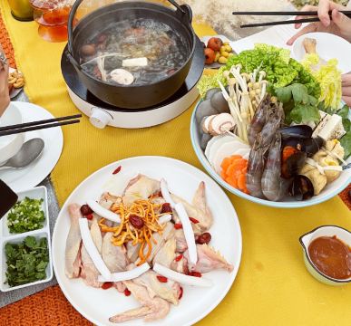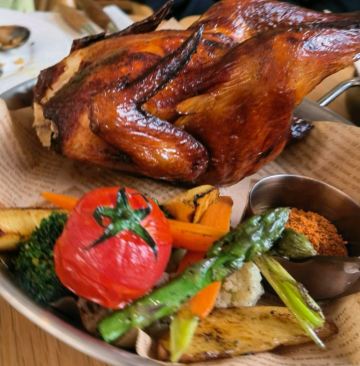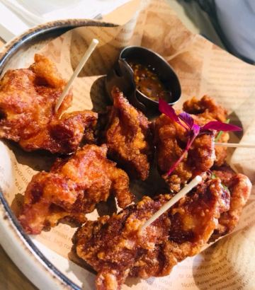 香松烤花椰菜,五香鸭香葱芝士馅饼,茉莉冰拿铁,椒麻松露双色薯条,胡同秘制炸鸡块,一颗桃子,布拉塔芝士核桃沙拉,红酒烤牛肋,炸鸡块,桑巴酱烤鲈鱼
